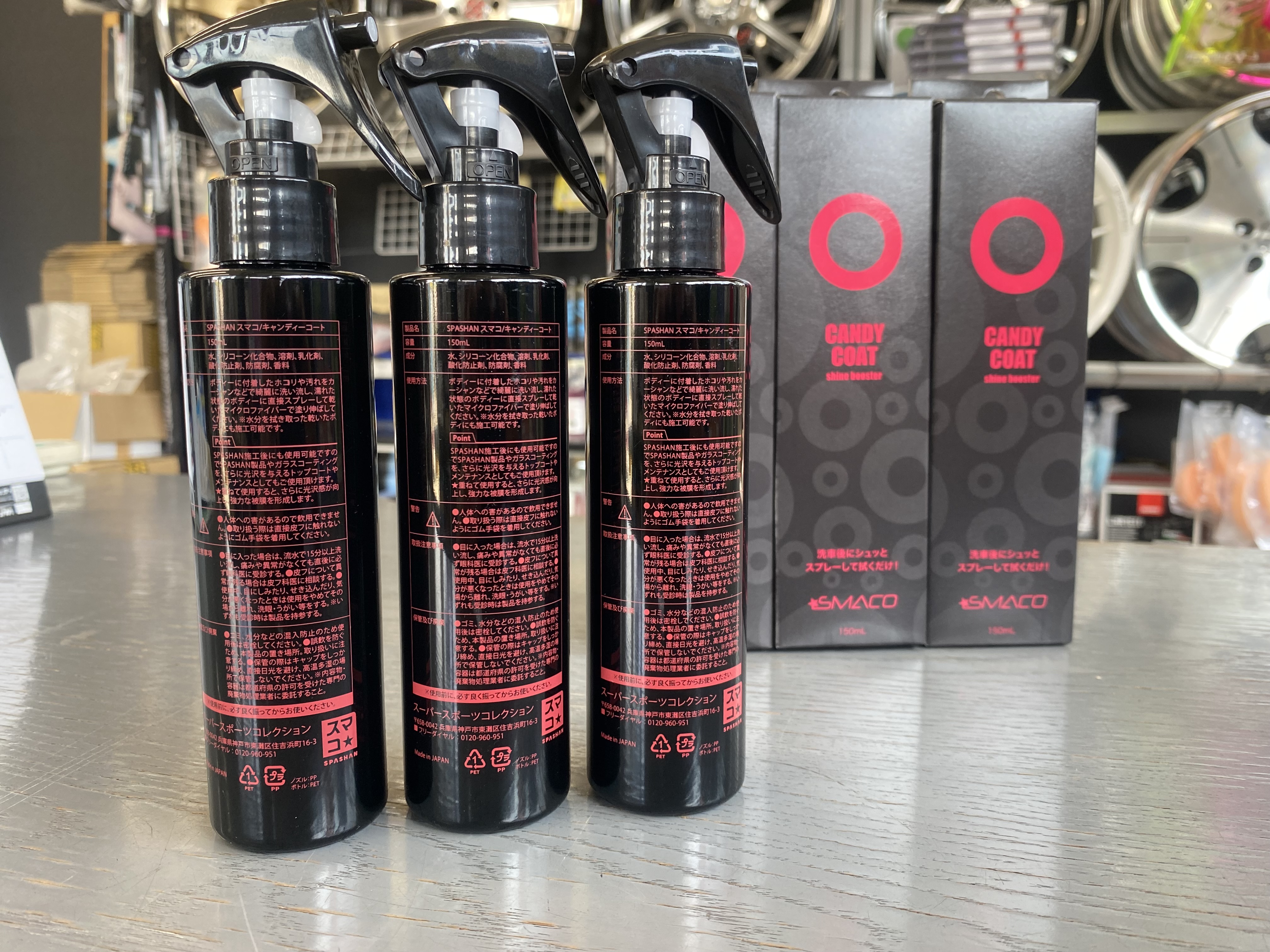 1個の値段になります。 内容量150ml 飴細工のような光沢重視 3ケ月耐久 摩擦係数を極限まで減らす事を重視した未体験の手触り感覚 濡れた状態・乾いた状態でも使用可能 スマコとは誰でも簡単に失敗なくハイクオリティなコーティングを楽しめるように 研究・開発されたスマートコーティングのことです。 CANDY COAT 飴細工のような光沢と手触りの心地良さを重視したモデル 雨が降った後、水滴が乾いて出来る、頑固な雨染みスポットも出来ないので雨上がりも安心です。 【使用方法】 洗車後の水滴が残った状態のボディーに直接スプレーしながら水分を拭き取ると簡単に施工ができます。 もちろん完全に乾いた状態のボディにも使用可能です。 SPASHAN施工直後のボディに水が残った状態でSPASHAN製品やガラスコーティングにより光沢を与えるトップコートやメンテナンスとしても使用いただけます。 重ねて使用すると、より光沢感がアップして強力な皮膜を形成します。 全ての商品、保管・施工には充分気をつけ、商品裏面、パッケージ裏面など読んでから使用、保管してください。 ヤフーショッピングサイト 楽天市場ショッピングサイト